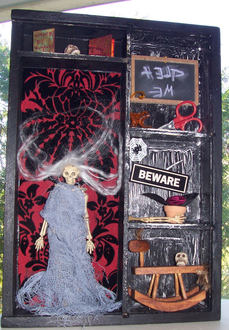 Adorning this part of the wall is a portion of the garden, rich with dark beautiful blooming nightshade, hemlock, black ivy & weeds! Tending the garden, as always, is Dahlia, she measures about 5 3/4 inches tall and her "bones" are formed of a plastic type material, with a nice touch of age added. She is dressed in her vintage "shades of purple" dress. Completing this dark landscape is Lestat, Dahlia's avian fiend and Maurice the black widow spider.